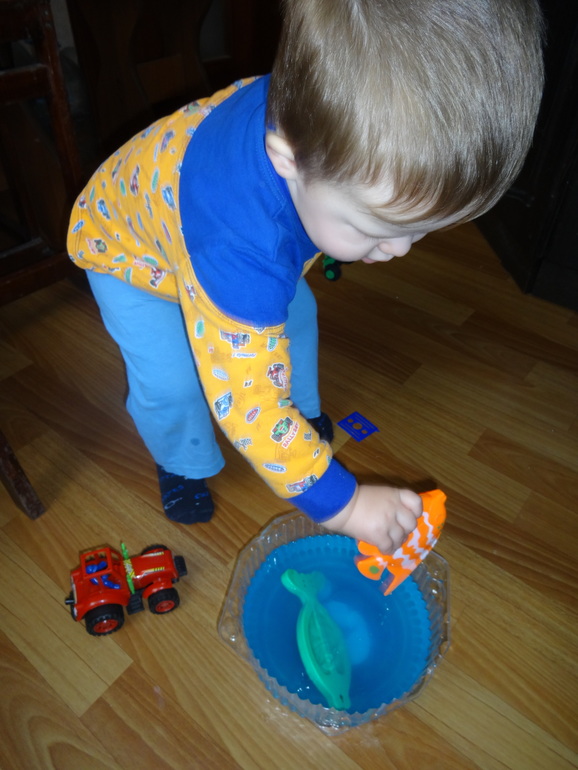 Выловили рыбок и большую ракушку. Запустили бумажный кораблик. Дуть у Женьки ещё не получается, только разочек плюнул от усердия :) Устроили бурю венчиком, кораблик утонул. Куча восторгу: "буран!", "Утону!" Пришлось повторить уже с чистой водой и новым корабликом. Конечно, трактора тоже немного искупались. Проверили тонет ли маленький танк. Танк тонуть отказывался, несмотря на совместные усилия :)