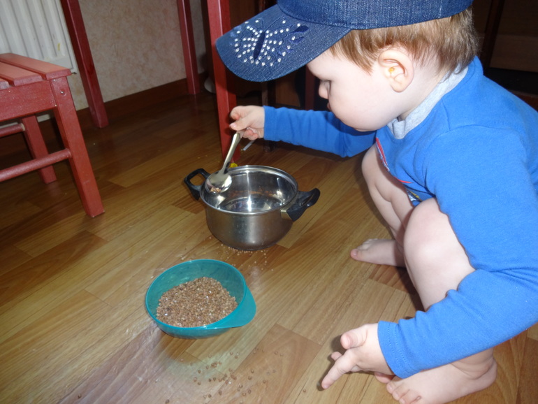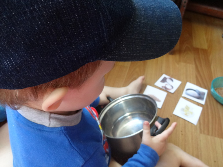 Пытались под стихотворение складывать продукты в кастрюльку. Женя не очень понял, что я от него хочу. Сахар он вообще первый раз видел)