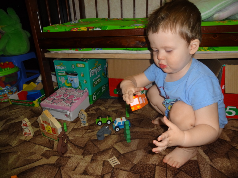 Вечером инсценировали Колобка кукольным театром, используя договаривания (я начинаю предложение, а Женя говорит последнее слово), но внезапно по лесу поехали машинки :) У меня такое ощущение, что любая наша игра переходит в игры с машинками, кранами и тракторами.