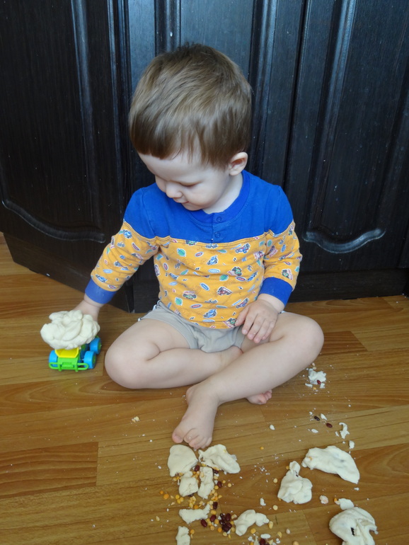 Пыталась предложить украшать большой пирог, но Женя придумал себе другую игру: расковырял все пирожки (очень понравилось искать в тесте крупу) и погрузил большой пирог в грузовик. В итоге игр получился большой пирог из машинки :)
