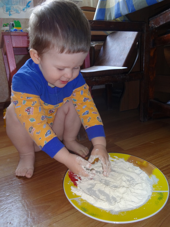 Я показала ему, как на муке рисовать. Он пытался калякать, но больше смотрел на то, как рисую я. Потом мы подлили водички и посмотрели, как получается тесто. Возюкаться в тесте ему понравилось, вокруг было ах как чисто :)