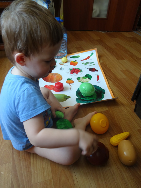 Сделали подобие лото из нашего плаката и игрушечных овощей. Начали рассказывать об каждом овоще, но что-то нас отвлекло, сейчас уже не скажу.