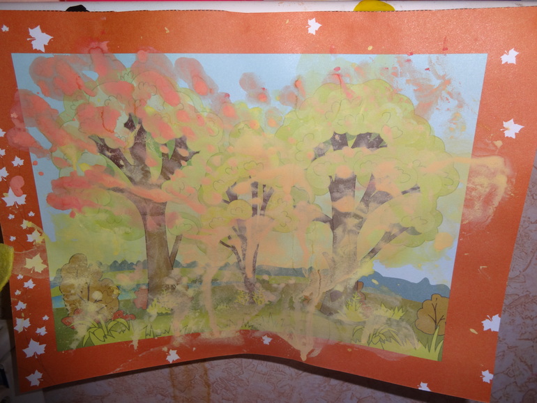 В первый день мы повторили цвета осени. Рассмотрели картины на осеннюю тематику, обсудили. Особенно приглянулась Жене картина Жданова "Осень" и нетрудно догадаться почему :)