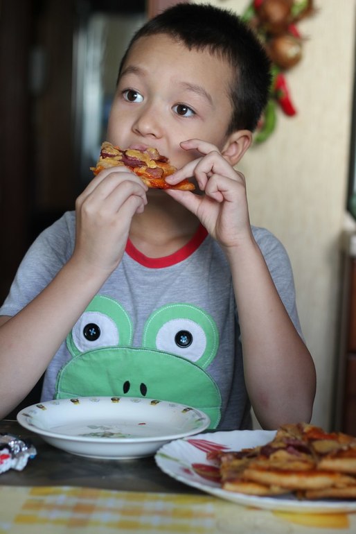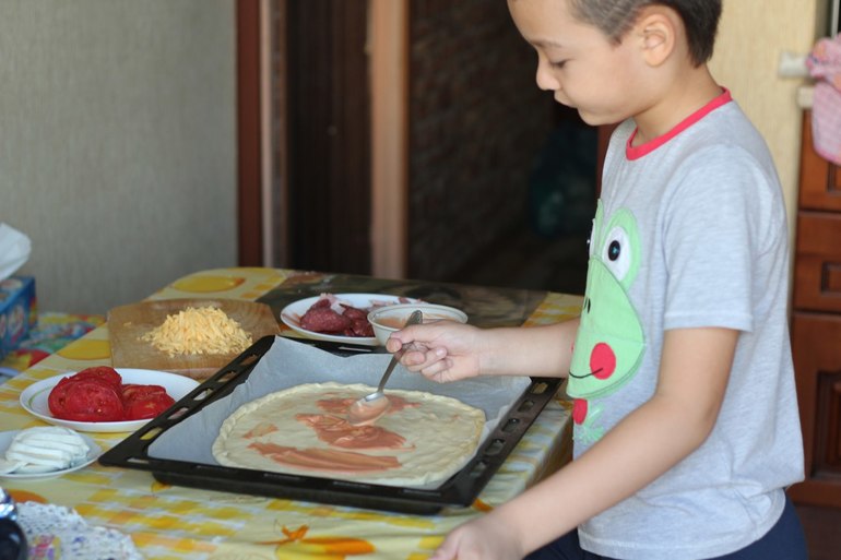 Потом ему позвонил сосед-друг, он пошел гулять во двор. Погуляли хорошо, что-то там повздорили, я пока успешно приготовила обед и ужин. А до этого он просил меня пиццу, договоились,что приготовим ее вдвоем. Ну и.... испекли. Я не спец по пицце, даже тесто было совсем не для пиццы, ну и что) Начинку выкладывал сам, от помидоров и мацареллы отказался(правда моцареллу я все равно потом положила). Вот мой поваренок...