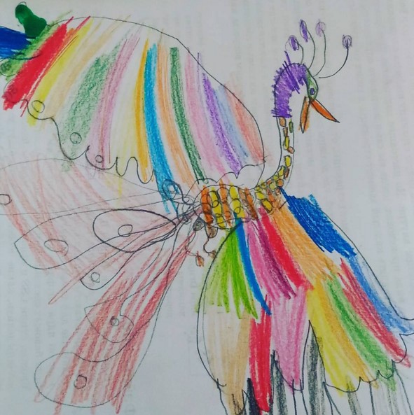 Вообще ничего не помогали. Она часами сидит и сама по себе что-то калякает-малякает, а потом нам пачку рисунков приносит, чтобы похвастаться. Думаю, что она скорее всего из книги срисовывала. Правда, в книге я такой птицы не видела.