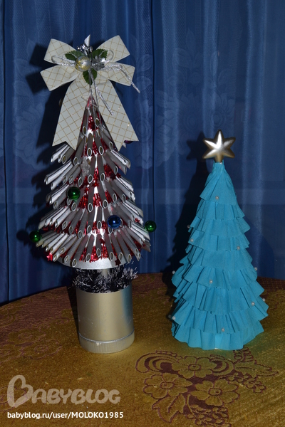 Сегодня весь вечер посвятила 2ум елочкам. блин такие красивые получились. в садике дали задание сделать, нарисовать, или слепить елку. вот я как раз недавно видела самодельные елочки здесь в рукоделке. одна из макарон получилась, другая из гофрированной бумаги. у меня идея родилась, наделать елок всем родным и подарить на нг. завтра с утра сфоткаю, на память и понесу сдавать. уверена они (воспитатели) охренеют от такой красоты. Поросила сделать воспит Максима, я решила и Кириллу тоже в группу сделать. похвастаться захтелось