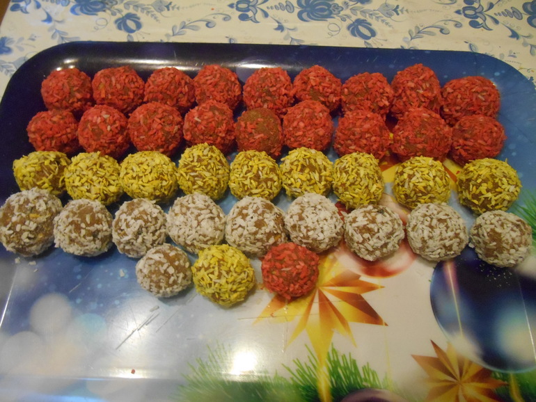 Банка вареной сгущенки,пачка овсяного печенья,кокосовая стружка.Печенье размять до крошки,смешать со сгущенкой.Сформировать шарики,обвалять в кокосовой стружке.Можно внутрь положить орешек.