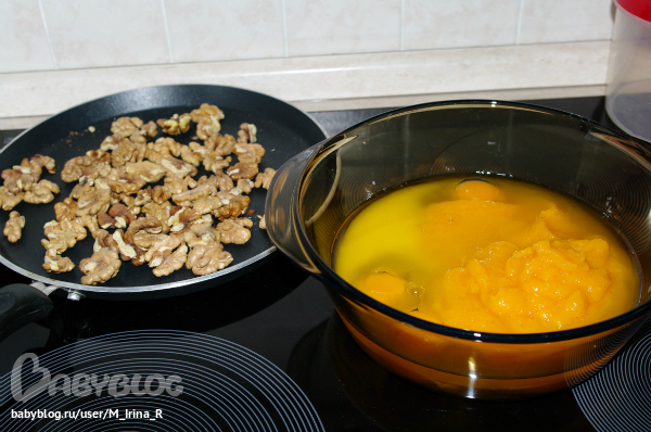Приготовить из хурмы пюре. Орехи обжаить 4 минуты.