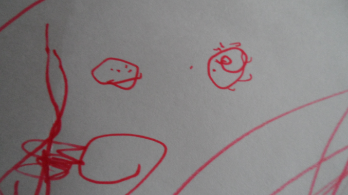 а мы рисуем каки-маляки)) какие-то черточки-палочки, кружочки, но ничего конкретного. то есть Марийка говорит, что она нарисовала солнышко или зайку, но на рисунке я вижу только палочки и завитухи))) может, я не понимаю высокого художества??)))))
