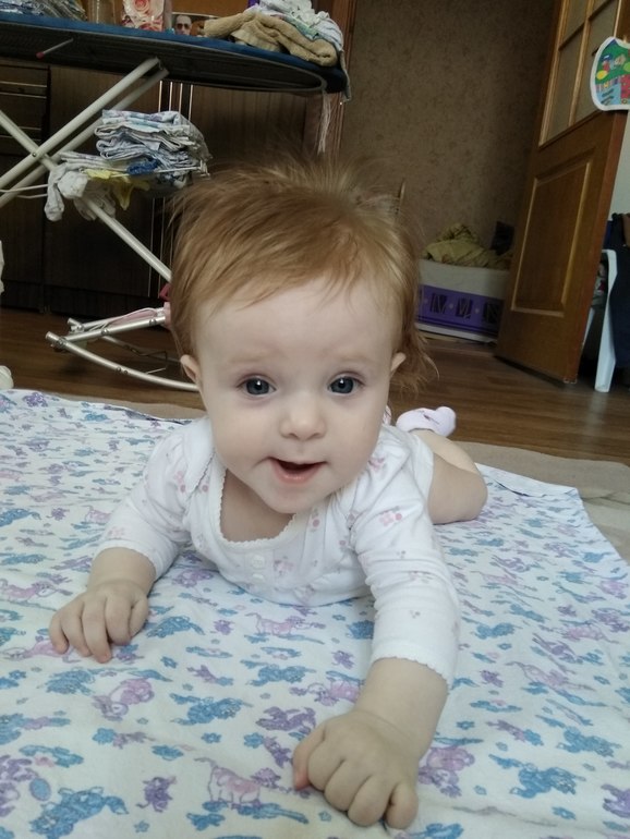 Крутится в обе стороны на живот и буквально сегодня сама стала подниматься на четвереньки с запахом передвинуться вперёд, иногда получается. За ручки любит подниматься в положение сидя, если схватит за пальцы, то уже готова.