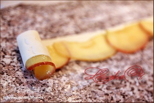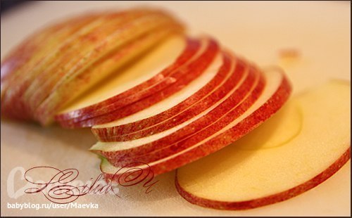Яблоки разделить на 4 части, удалить сердцевину, нарезать очень тонкими дольками, 2-3 мм.