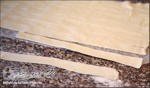 Слоёное тесто тонко раскатать, нарезать полоски 2х30см.