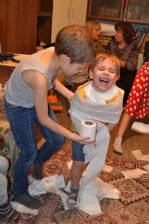 Потом были игра мумия. Нужно было ребенка обмотать туалетной бумагой. Было две команды, но конкурс, хоть и получился смешной, не совсем удался. Бумага рвалась от каждого движения, хотя детям по-моему так даже было веселее)