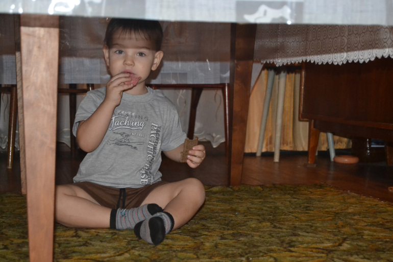 Максим ест колбасу под столом) Иначе мама не разрешает)