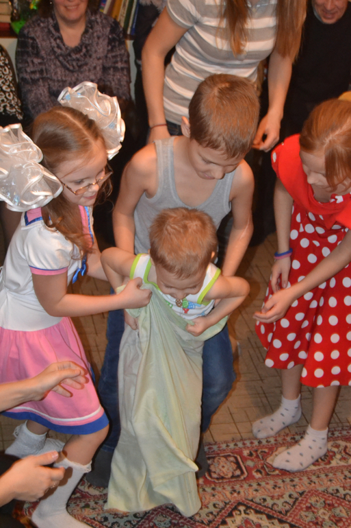 Еще был конкурс с наволочками. Детки разделились на две команды и скакали в наволочках вокруг стульев. Для такого конкурса нужно больше места.