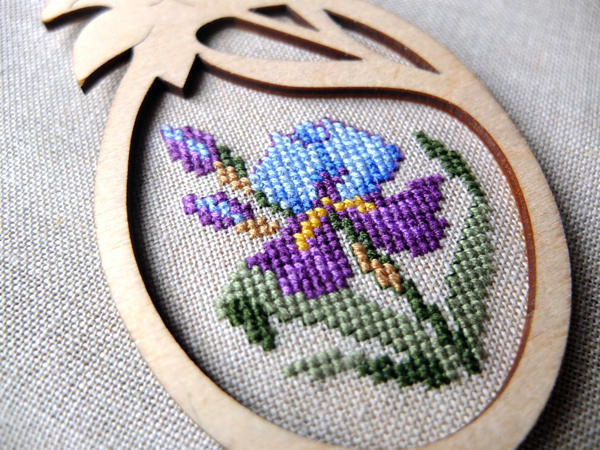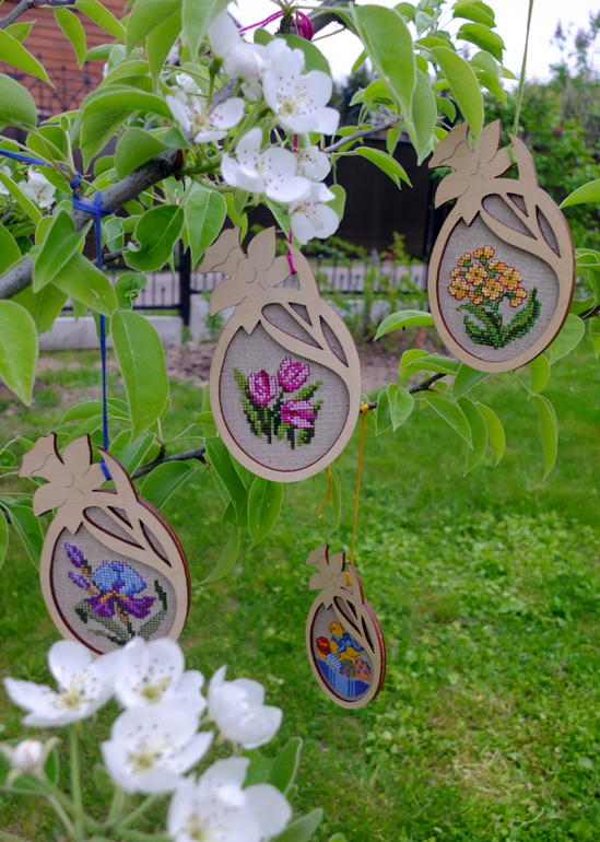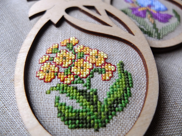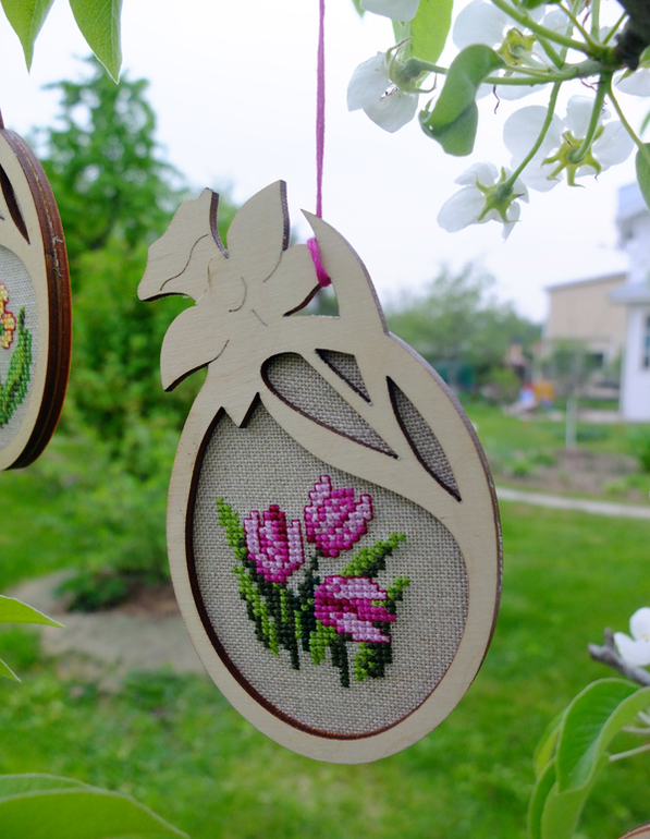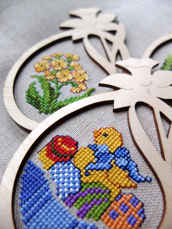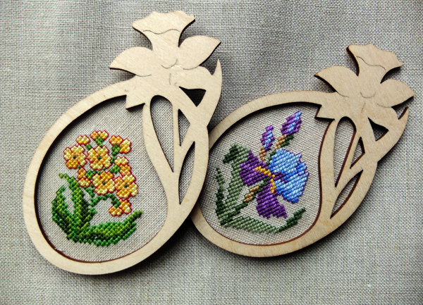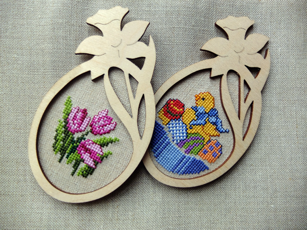 Отшив предлагался на Аиде, но я ее разом заменила на лен Belfast 32, цвет 52, кажется (лен натуральный), а нитки оставила Анкор, но подбором. Мне для полного счастья не хватало только таких вот фанерных рамочек. Пообщавщись с мастерскими, которые режут лазером всякие фанерные заготовочки, я нашла замечательного продавца и мастера, которые согласились сделать и продать мне всего двадцать штук. Сделала эскиз, отправила, и через недельку забирала уже свои заветные цветочные рамки. А к ним я попросила еще и такие же фанерные задники в виде простого яйца, на которые и клеила вышивку.
