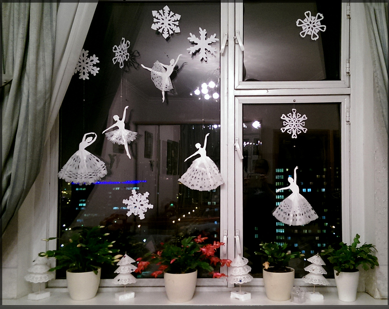 Ну, тема балерин из бумаги уже вроде как второй год, а то и дольше, муссируется в сети, но в этом году Ксюшка так часто изображает из себя балерину, что я решила реализовать идею на окошке. Шаблоны самих балерин можно найти в любом поисковике, я их резала из акварельной бумаги, а вот юбки советую "выкраивать" из последнего слоя многослойных салфеток, тогда они воздушные и легкие. Режутся как обычные снежинки. А дальше под реплики "Мам, одень балерине платье, ей холодно!" надеваем и приклеиваем.)) Ксенька подавала жемчужинки, игралась с балеринками и весело скакала, пока я их на окно вешала. Тут ее роль была невелика)) Теперь балерины бодро шевелятся от сквозняка. Танцуют))