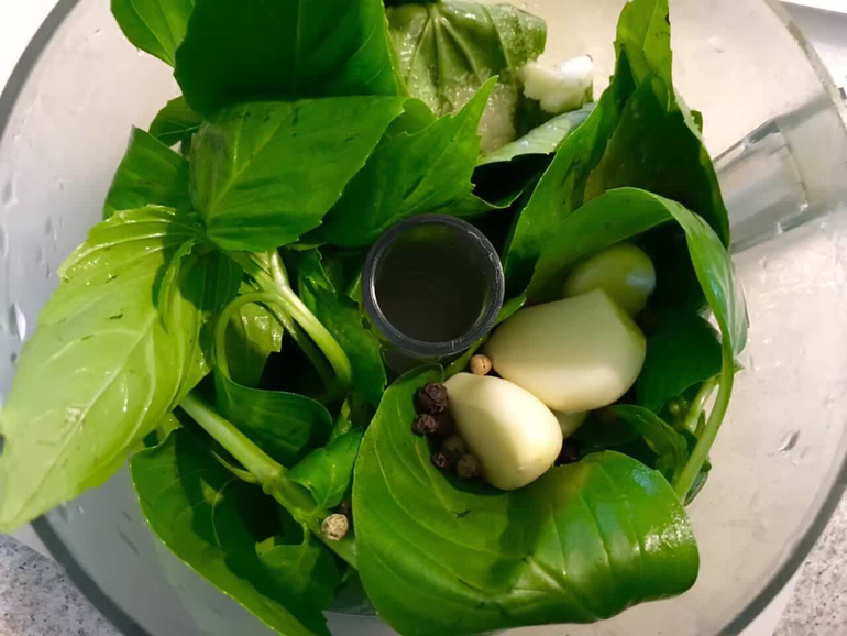 Для соуса взять пучок базилика, сок одного лимона, 3зубчика чеснока, пару столовых ложек оливкового масла холодного отжима, соль по вкусу, смесь перцев. Все в блендер и перебить. Соус готов.