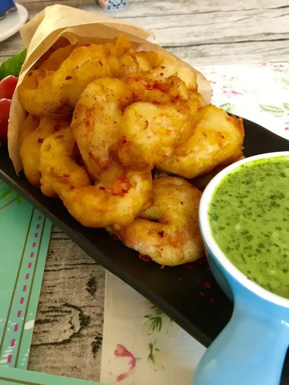 Получилось очень вкусно: нежный хрустящий сырный кляр и сочная креветка внутри.