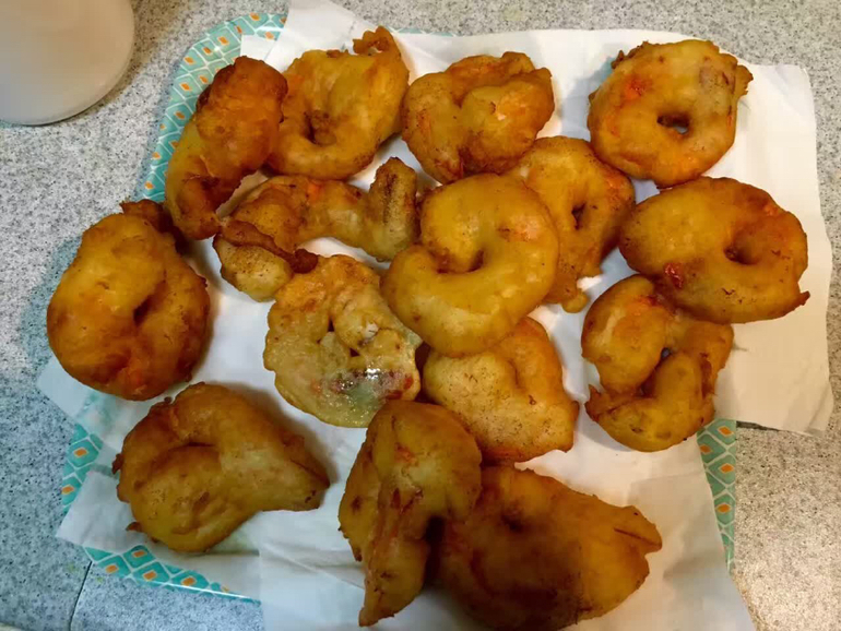 Закинуть их в кляр, перемешаться оставить на пару минут. Жарить в кипящем масле около 2-3х минут, до золотистого цвета