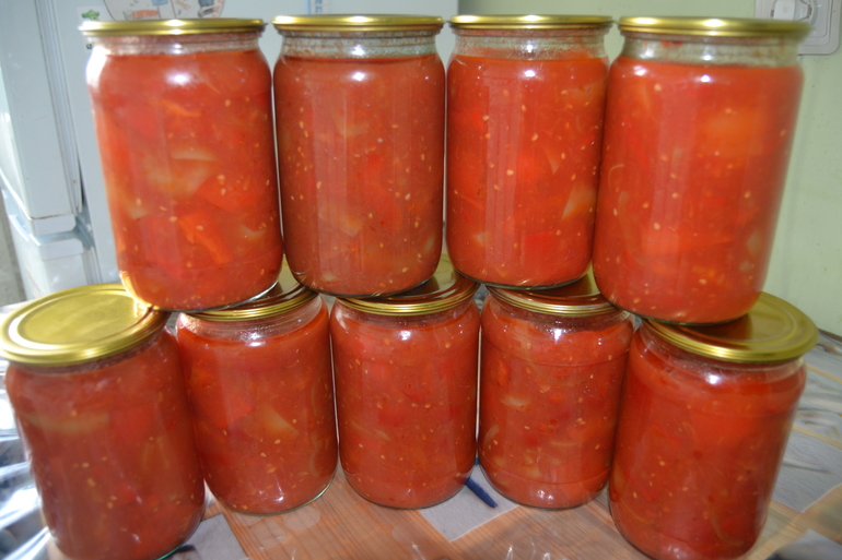 Перец очистить и порезать как нравиться, крупными частями главное, кубики или продолговато, помидоры перекрутить в томат и залить перец, добавить все кроме уксуса и варить 20 минут на медленном огне, в конце влить уксус и дать прокипеть 1 минуту, разлить по стерилизованным банкам закатать, перевернуть и укутать в одеяло на ночь.