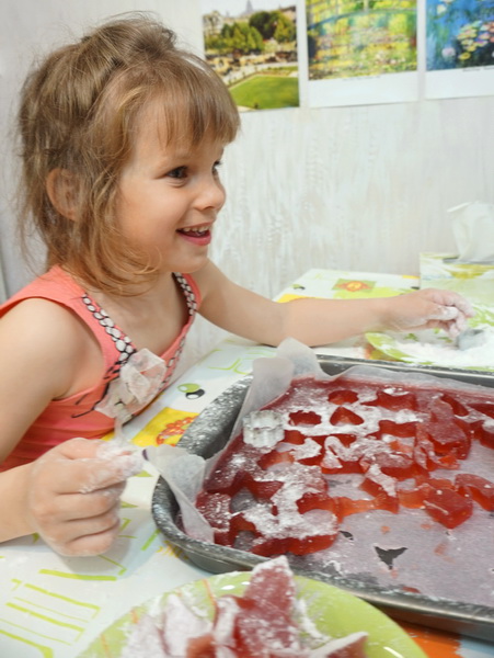 Если не обвалять мармеладинки в сахаре, то они будут липнуть к друг другу! Можно еще обваливать в сахарной пудре, но тогда вид у конфет будет не такой аппетитный))