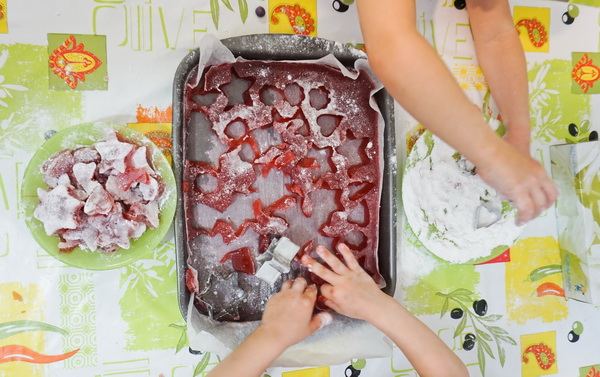 Мы часто дома готовим что-нибудь сладенькое.Дети уже неплохо мне помогают - могут сделать тесто, порезать фрукты, испечь блины, вырезать печенье, накрыть на стол,достать посуду из посудомойки и разложить всё по местам.Впервые они взяли нож в руки в 2 года (столовый), с тех пор мои маленькие помощницы во всём мне помогают. У нас уже есть маленькая сковородочка-блинница - чисто для детей. Помню, как Юля накануне своего 2-летия корявенько, неровно, но с большим старанием почистила свои первые яйца. Я всегда буду помнить это. Тогда дети за день до своего ДР сильно заболели, поднялась температура, и, конечно, гости к нам не пришли. Дети были так слабы, что у Настёнки не было сил задуть свечки на торте, который я всё равно испекла, чтобы их порадовать,и я взяла её за ручку и мы вместе задули огонь) Хотя они съели по маленькому кусочку, всё равно тортик их очень порадовал.