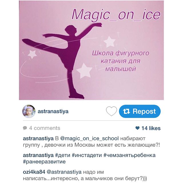 Друзья! Теперь страничка Школы Фигурного Катания Magic_on_ice и в инстаграм. Подписывайтесь и следите за новостями школы. Обещаем много полезной информации и конкурсов Ждем комментарии и пожелания. А на своих страничках отмечайте фото наших юных фигуристов хэштегом ✨