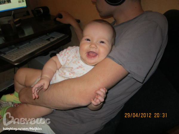 какая веселушка-хохотушка,и мы тоже с папой около компа всегда заседаем))))