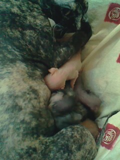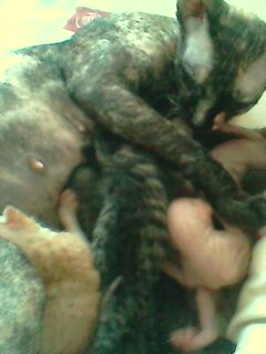 Обнимашки. Здесь видно волосатого мальчика. Он родился самый первый. Шерсть волнами. Полосатый видимо в папу. Получился симпотишный мальчик. Самый сильный. Второй мальчик рыжий, слегка волосатый, тоже сильный. Вдвоем отбивают у остальных сиськи. Приходиться каждому засовывать сиську в рот, чтоб без драк.