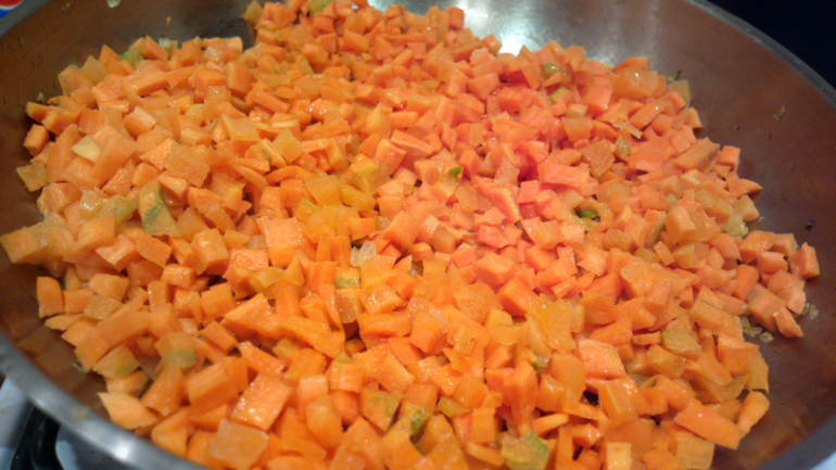 Морковь нарезаю кубиками и тоже слегка обжариваю.