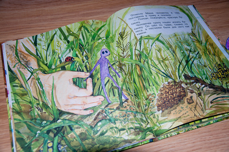 (А вы видели лисичку на последних страницах? Чудо - как хороша! А еще поле с кузнечиком! А бабушка какая? А рисунки у Маши в комнате? Это вообще сказка в сказке!)