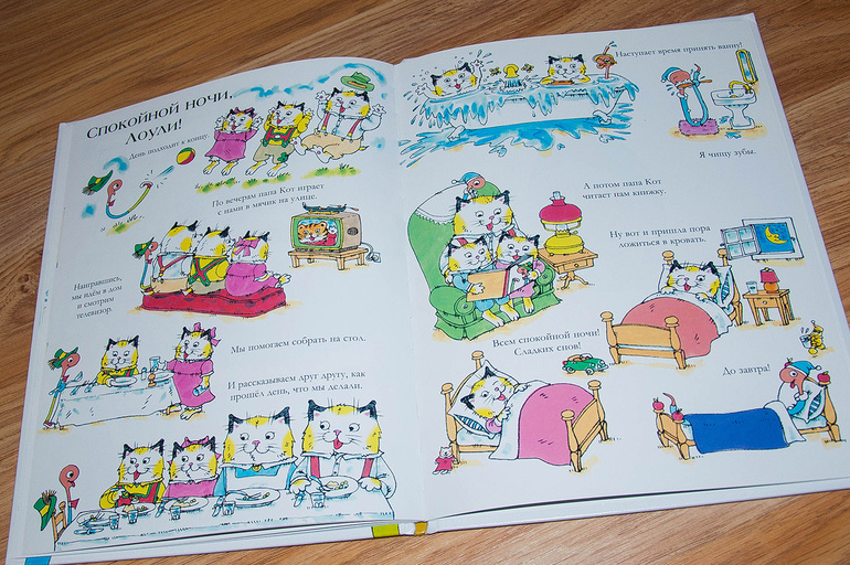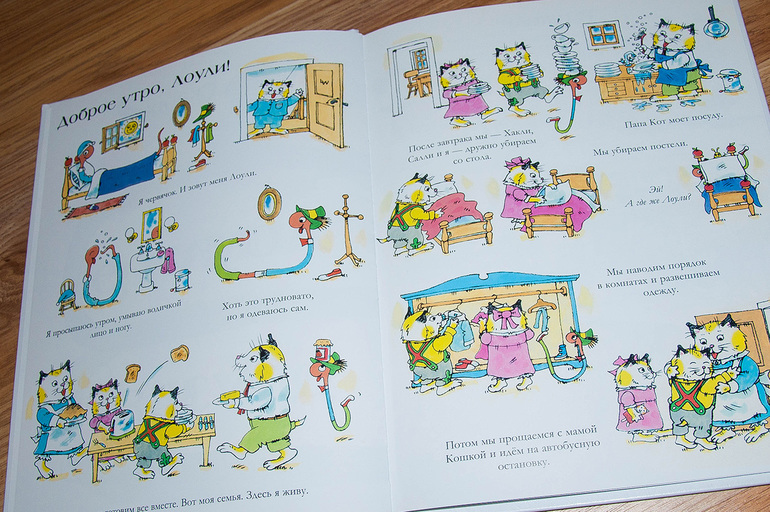 Уже на второй странице Лоуи прячется за подушку. Надо искать! Кстати, пока все дружно убирают со стола и моют посуду, мама кошка ушла в подполье. Интересно, чем она занимается?