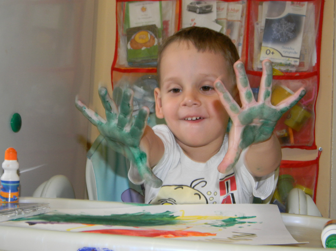 не пачкается, бывает специально ладошками рисуем но потом сразу бежит руки мыть, а так одежда всегда чистая. Могут руки все в краски быть а майка белая вся чистая, сейчас покажу))