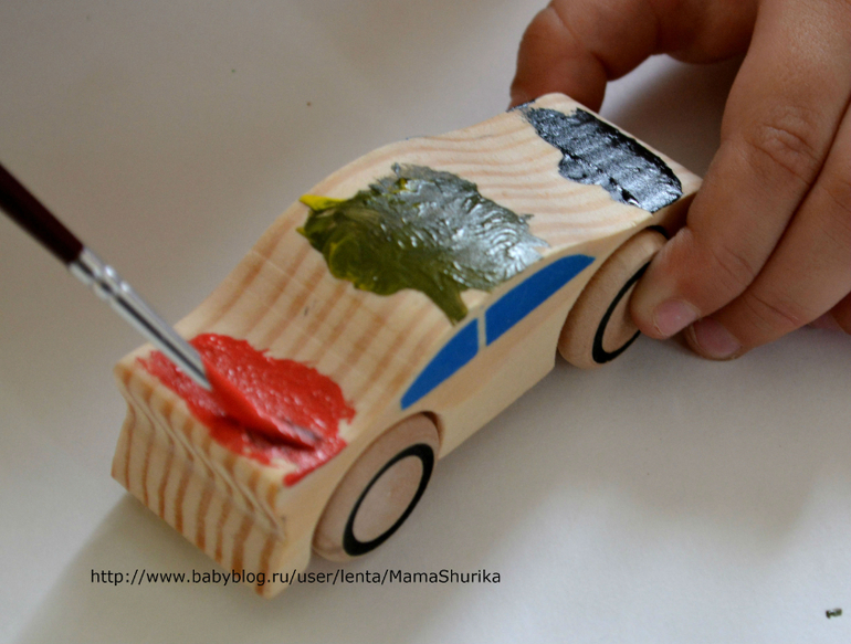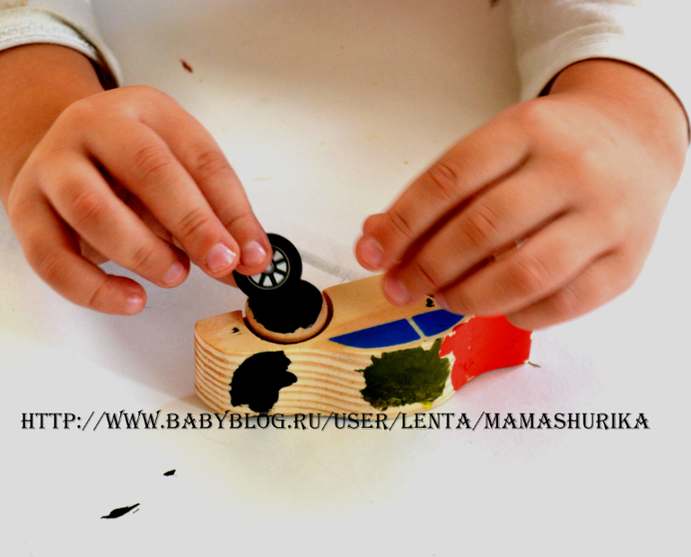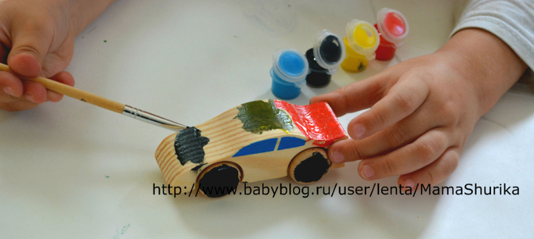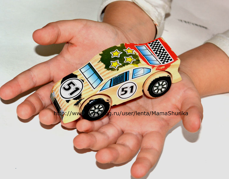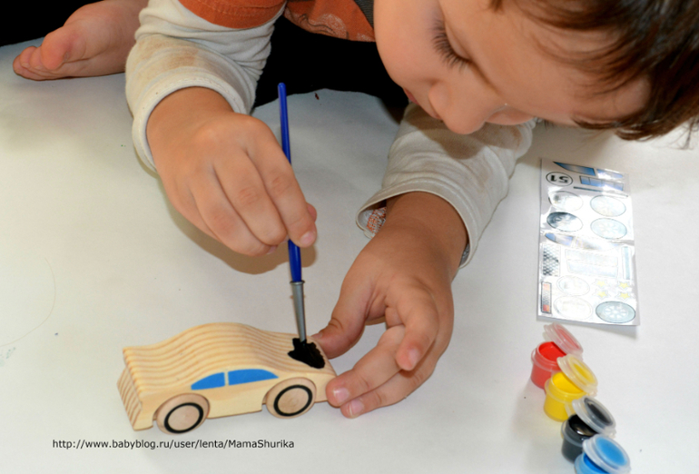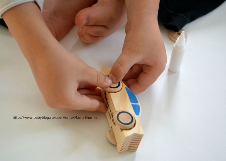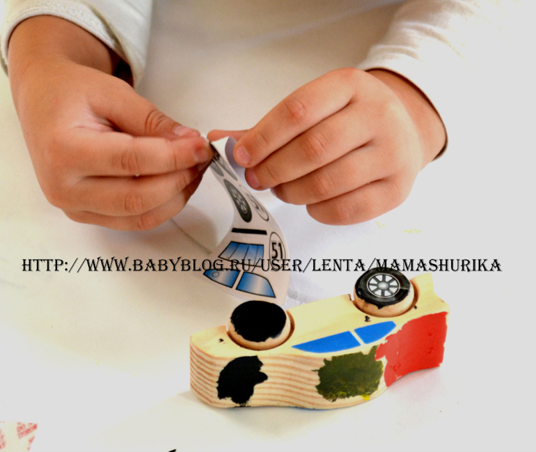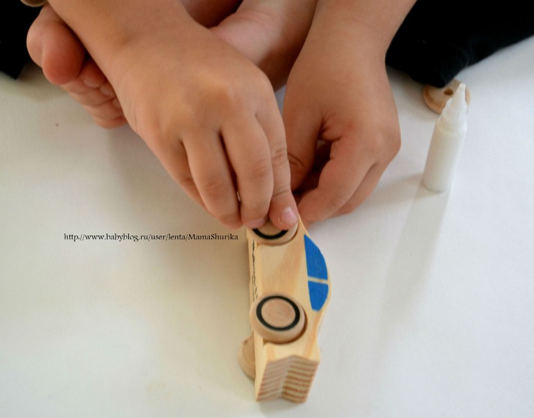 Шурик всё делал полностью сам, вставил ось, наклеил колёса, раскрасил машинку и украсил наклейками, моя помощь вообще не потребовалась. Так что набор действительно может самостоятельно использоваться ребёнком.