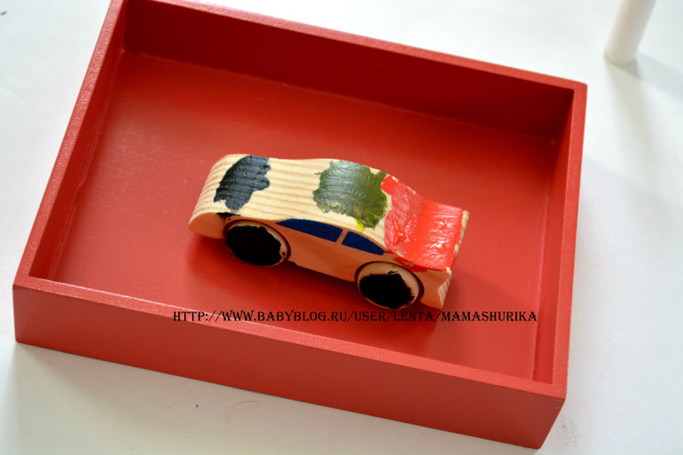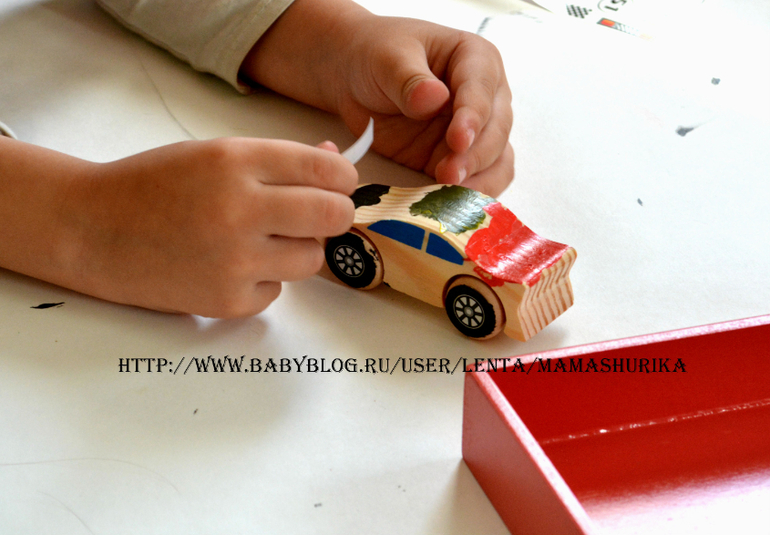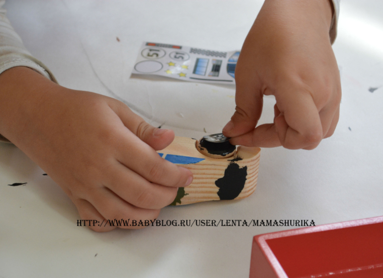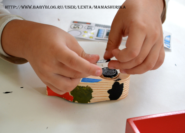 Ещё в наборе есть наклейки, после того ка деревянная машинка подсохнет, можно клеить наклейки (красная деревянная коробочка тоже в комплекте)!