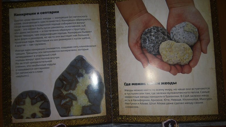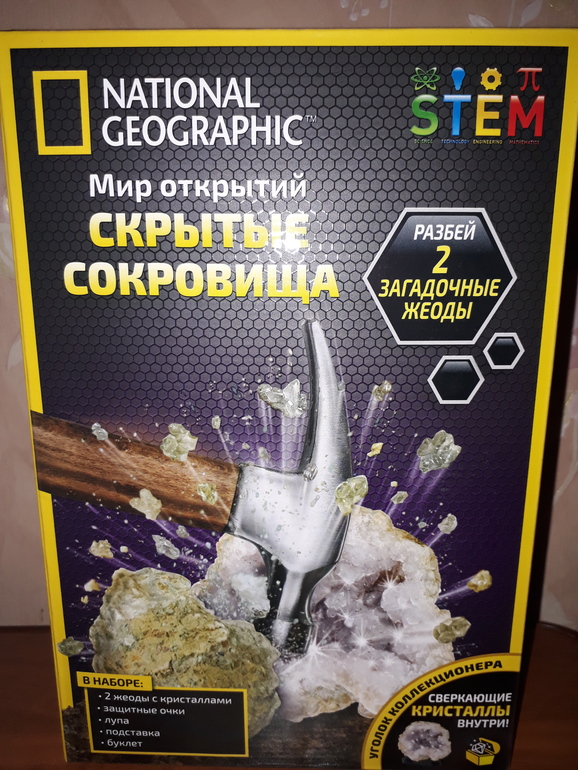 Сама коробочка оказалась прочной и качественной Внутри мы обнаружили защитные очки,лупу,подставку для образца,буклет и инструкцию И пару вот таких на вид невзрачных камешков-достаточно крупных и увесистых Это жеоды-полые,природные образования с кристаллами внутри