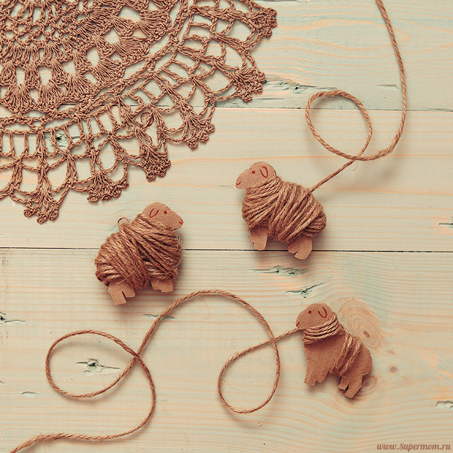 Делали овечек из картона и крафт-веревки. Потом мы этими овечками украсили наши штоллены, завернув их в бумагу для выпечки, повязав банты и отправив в подарки.
