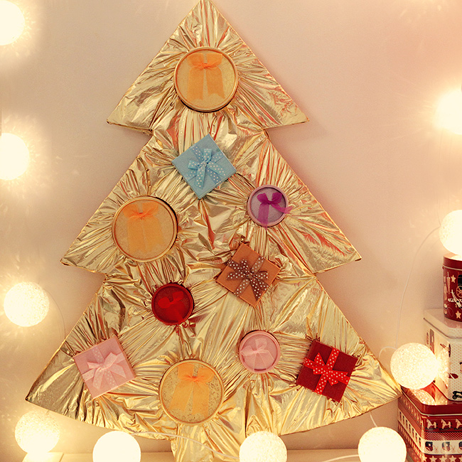 Кстати, если не помните, в прошлом году у нас была елка из картона и фольгированной бумаги: