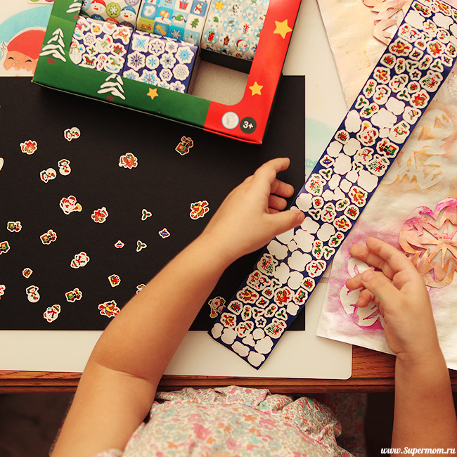 И еще наклейки, тоже из Имаджинариума. Ребенок так обалдел от счастья, увидев 1000 наклеек, то даже сразу не сообразил, куда их еще можно, кроме бумаги-то.