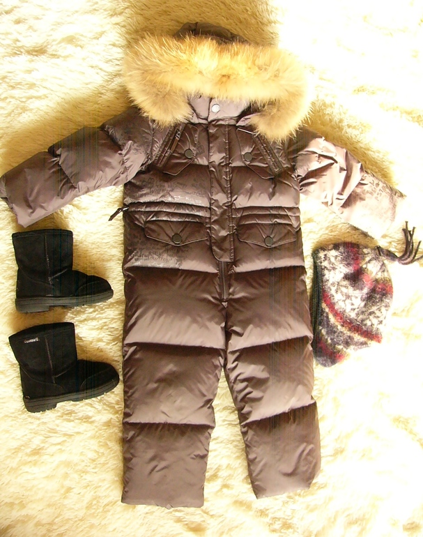 В размер. Мы носили до роста 100, потом пришла весна. Цвет коричневый. Шикарный, воздушный и очень тёплый комбез! Каждую зиму беру эту марку. 80%пух, 20%перо. Натуральный мех енота. Тефлоновое покрытие. Утяжка по талии, клапаны на карманах, защитные манжеты на ручках и ножках. Трикотажная хлопковая подкладка.