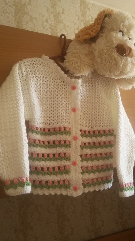 Начала вязать это чудо еще осенью, когда вышла на работу, но получилось ее довязать только сейчас=)) Почти год прошел. Кофтенка нам уже стала мала. Так и не поносила ее моя конфетка....