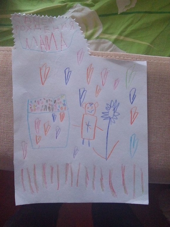 Сегодня чудесное утро! И я получила самый лучший подарок ))) Подписывала доченька сама) Как всегда море сердец, цветы, далее нарисована мама-ляля, как сказала моя Оля, небо (там, где надпись) и пасочка)))))) Мы всё ещё под впечатлением Пасхи)