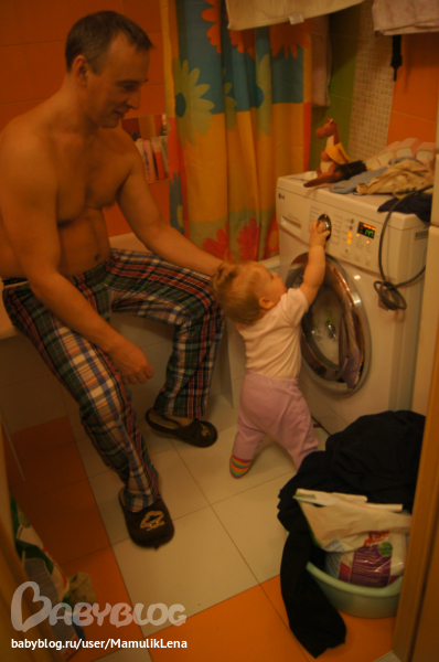 Мы тоже любим стирать.Еще любит вытаскивать постиранное и вываливать на пол,чуть мама зазевается.
