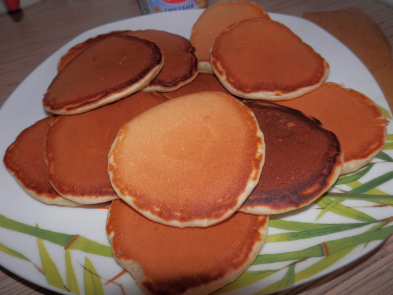 Смешиваем муку, соль и разрыхлитель. Отдельно смешиваем молоко, сахар, яйцо и масло, к полученном массе добавляем сухие ингридиенты. Мешаем до исчезновения комочков. Разогреваем сковородку. Масло не добавляем! Ложкой выкладываем тесто.Как появились пузырьки, чуток ждем и смело переворачиваем.![]()