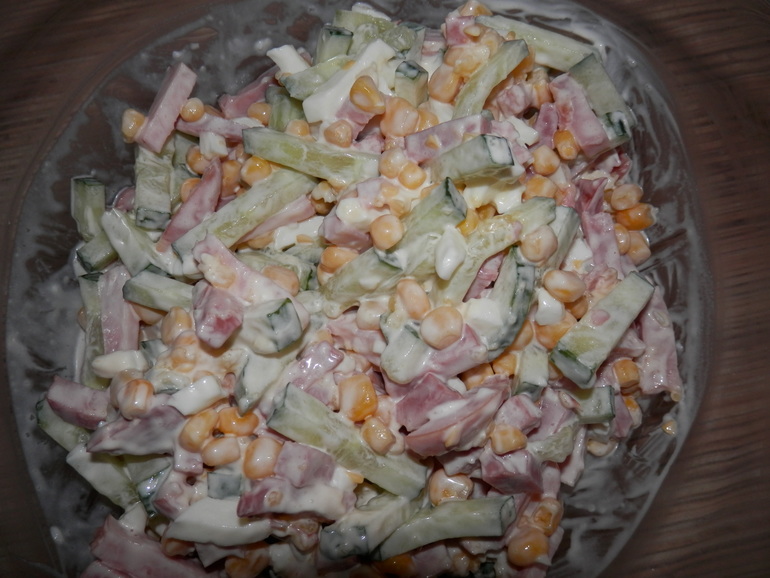 Все режем соломкой, смешиваем, заправляем майонезом.