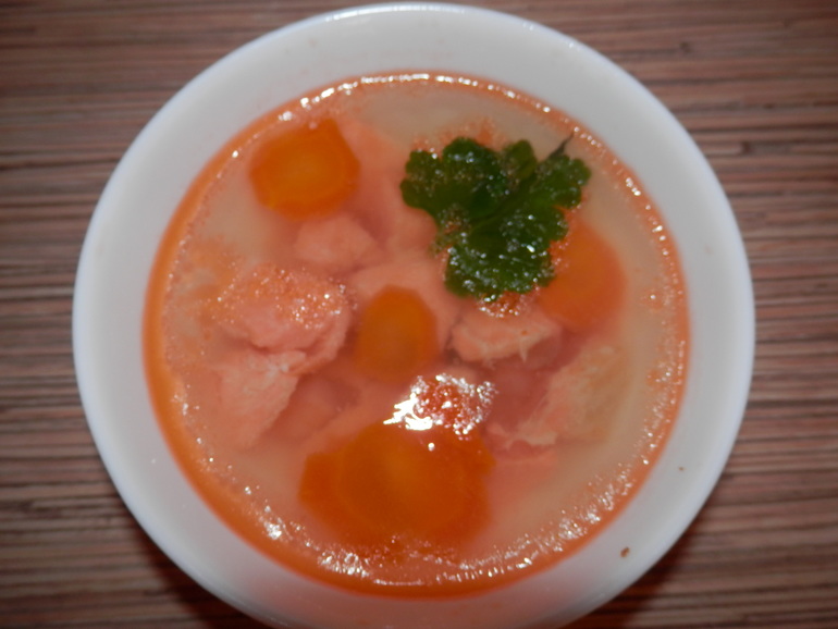 Варим бульон из рыбы с добавлением моркови, лука и лаврового листа. Готовый бульон процедить и смешать с желатином. Лук выкидываем, морковь режем кружочками. В пиалу выкладываем креветки, кусочки рыбы, морковь, заливаем бульоном и украшаем зеленью. Поставить в холодильник за застывания.