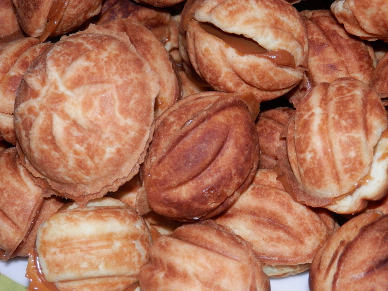 Желтки и белки растереть с сахаром по отдельности, до образования однородной массы. Соединить и добавить размягченный маргарин. Муку добавлять частями (у меня ушло чуть больше 2-х стаканов). Замесить тесто и разделить его на маленькие шарики. Выпекать в форме. ( у меня старая советская орешница) Затем остудить, начинить вареной сгущенкой и наслаждаться вкусом детства!!!