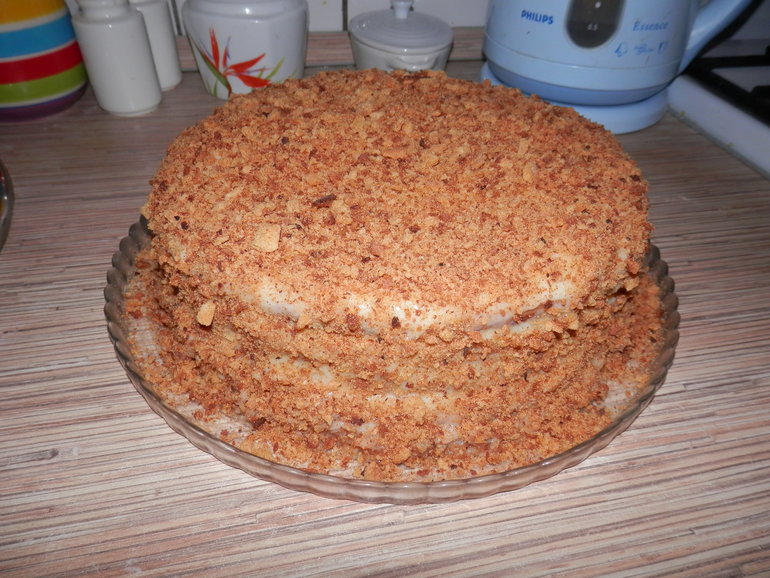 Готовые, вырезанные коржи обильно смазываем кремом (в том числе и бока). Сверху весь торт присыпаем раздробленными в крошку обрезками от коржей.![]()
