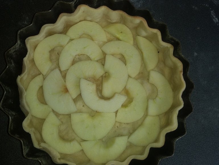 Запечь пирог до золотистости. Если начинка жидкая, до яблок припорошить дно крахмалом.